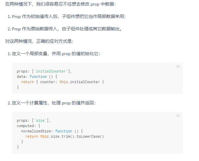 prop 是单向绑定的:当父组件的属性变化时,将传导给子组件,但是不会反过来。这是为了防止子组件无意修改了父组件的状态——这会让应用的数据流难以理解。